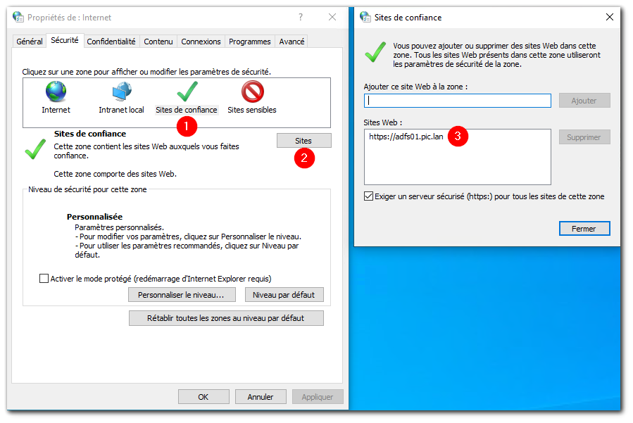 - Dans l'onglet "sécurité", cliquer sur "Sites de confiance" puis sur le bouton "Sites" afin d'ajouter l'URL du serveur ADFS.
