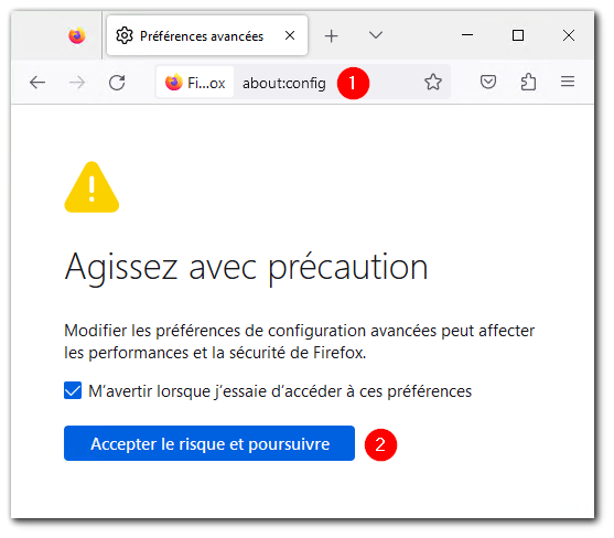 - Sur le navigateur Firefox du client, taper "about:config" dans la barre d'adresse afin d'accéder aux paramètres avancés, puis en bas du message d'avertissement, cliquer sur le bouton "Accepter le risque et poursuivre" :